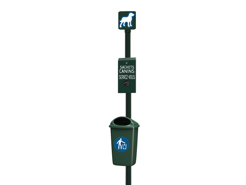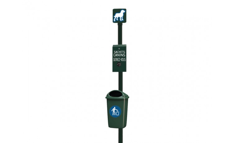 Composée d'un distributeur de sachets à déjections canines en liasse, d'une corbeille de propreté, d'un mât à sceller ainsi que d'un haut de mât particulièrement visible de très loin pour les propriétaires de chiens