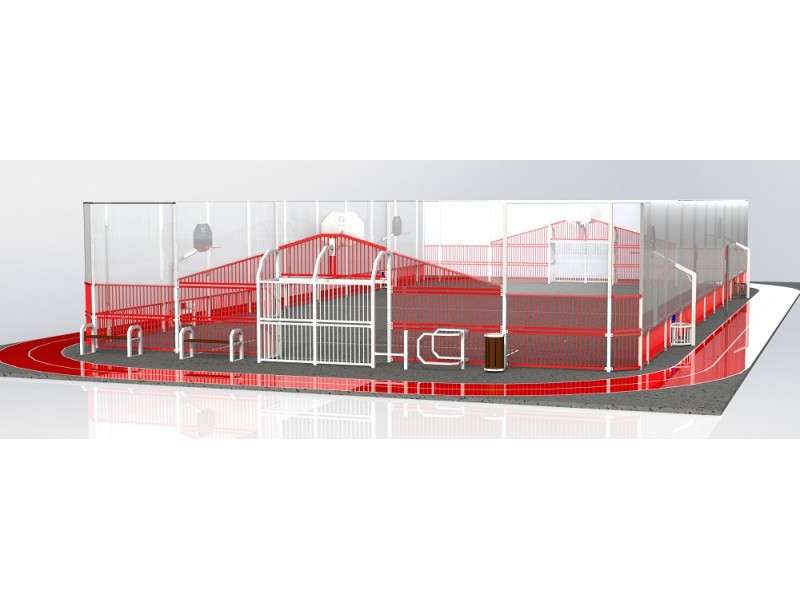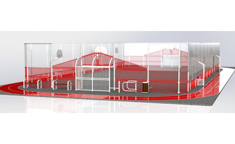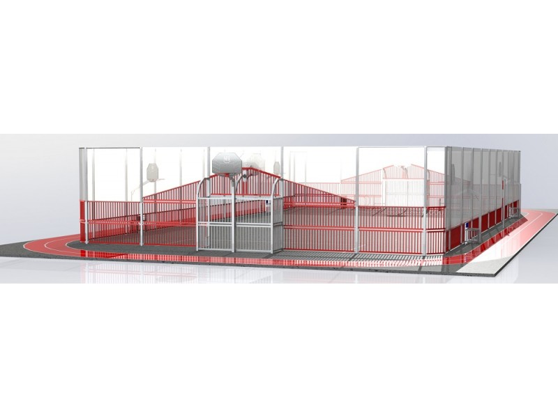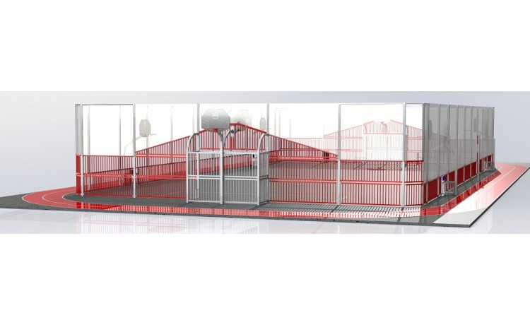 2 buts hand/basket barreaudés dont 1 avec 1 côté fermé et 1 côté avec 1/2 passage barreaudé anti-vandalisme et 1 but avec 1 côté fermé et 1 côté accès PMR