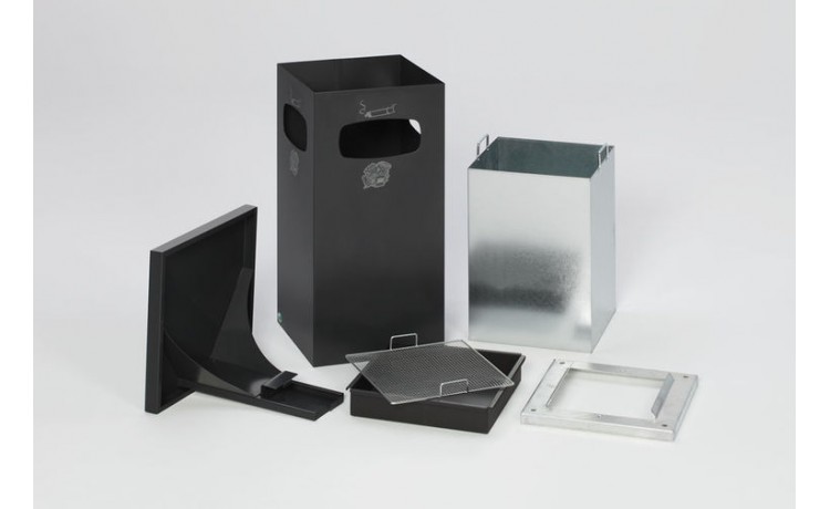 Coupelle pour le sable en tôles d'acier galvanisés, revêtu epoxy noir, tamis mégots galvanisé, cadre galvanisé et seau intérieur en tôle d'acier galvanisés avec poignées. Toit renforcé, 3 ouvertures.