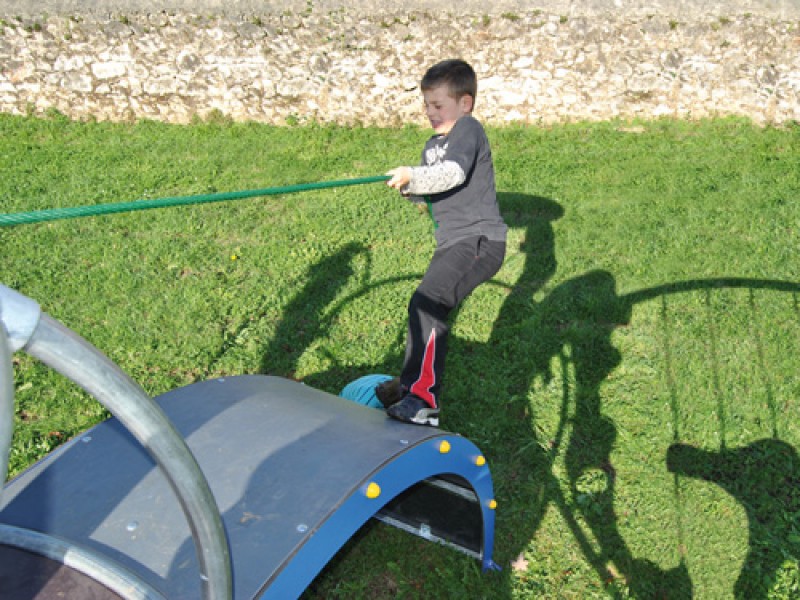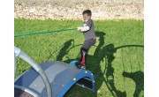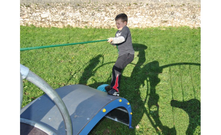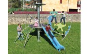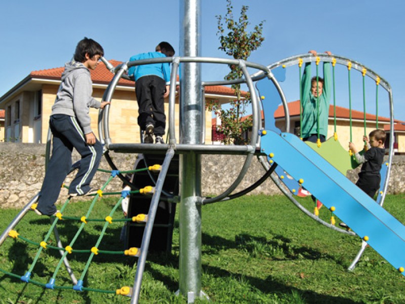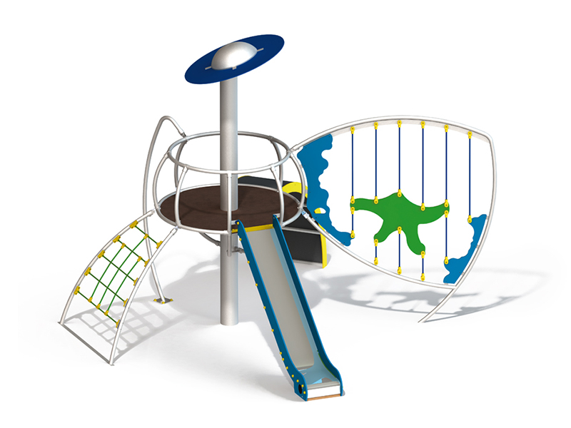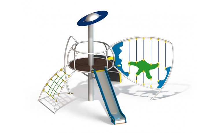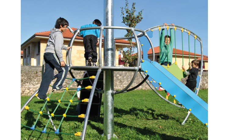 Composé de : Tour à une seule plateforme sphérique avec toit circulaire incliné, jeu de cordes courbe, jeu de cordes étoile, rampe incurvée, barre de pompier incurvée et toboggan en acier inoxydable et HPL de H= 1,50 m