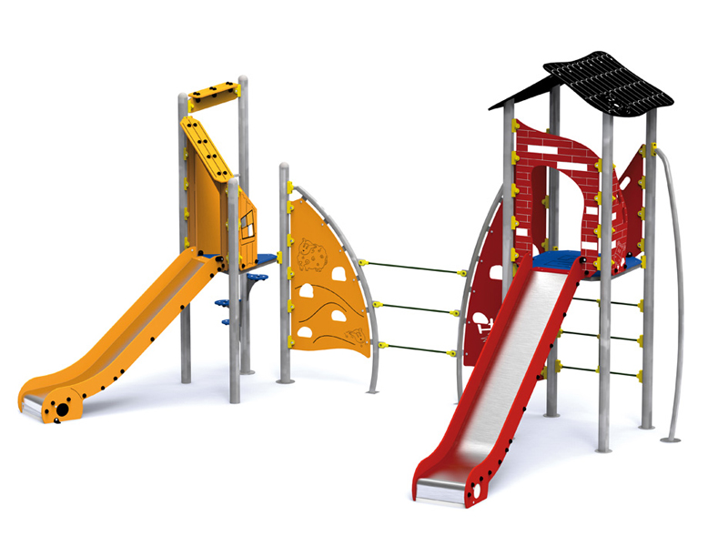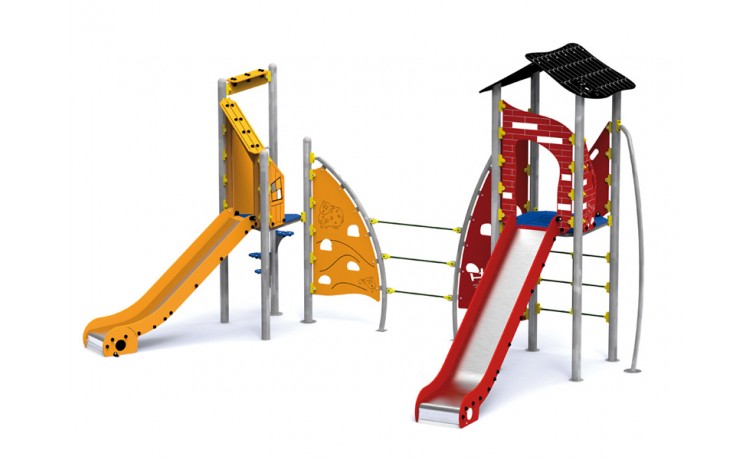 Composé de : Tour à une seule plateforme sphérique avec toit circulaire incliné, jeu de cordes courbe, jeu de cordes étoile, rampe incurvée, barre de pompier incurvée et toboggan en acier inoxydable et HPL de H= 1,50 m