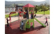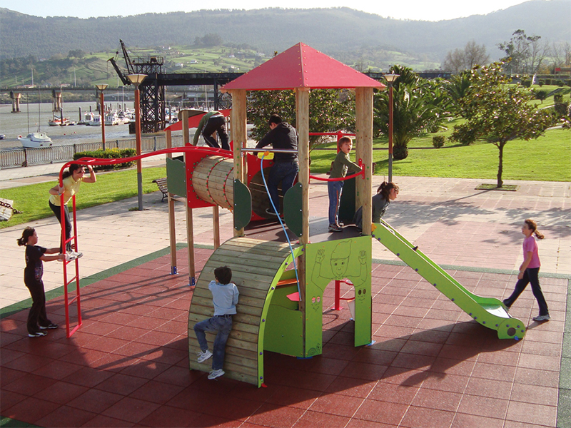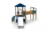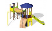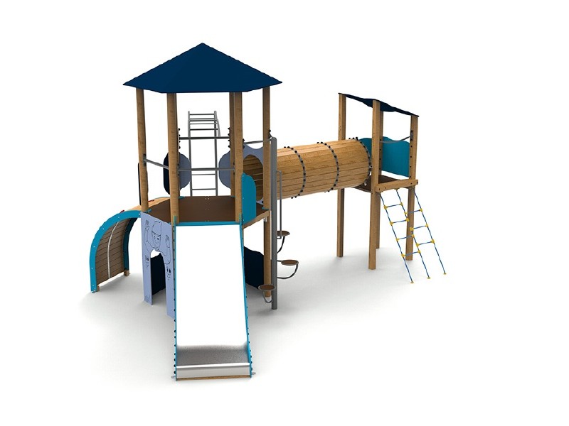 Ensemble se composant d'une tour hexagonal avec toit, d'une table et sièges, d'un escalier, d'une rampe, d'un escalier ondulé, d'un tunnel avec petite tour et d'un large toboggan en acier inoxydable et HPL d'une hauteur de 1.50 ml