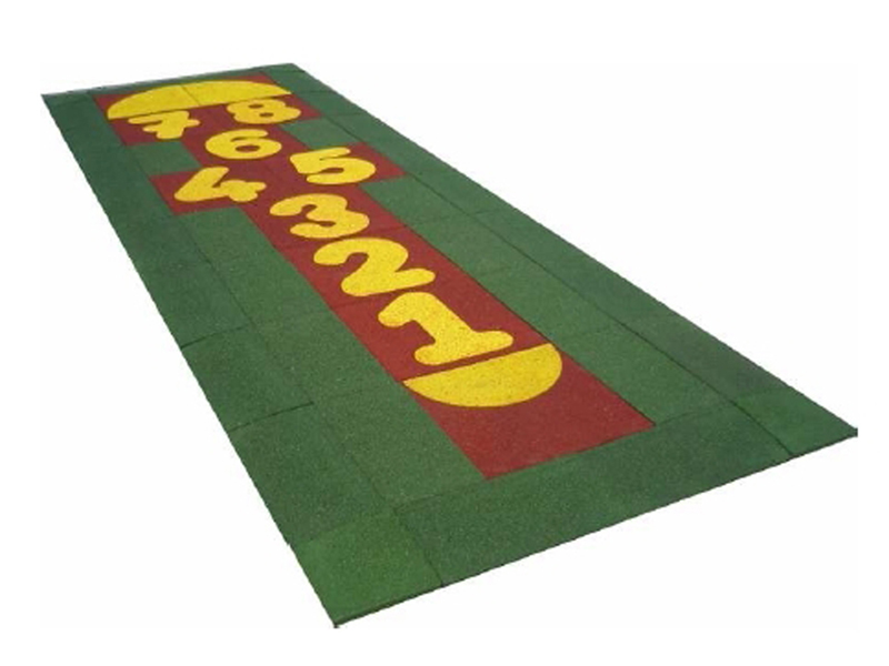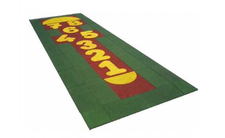 Fourniture d'une marelle de 11 dalles composées de caoutchouc calibré, mélangé à un liant coloré dans la masse, avec les 8 chiffres (de 1 à 8) et 3 motifs (représentant le ciel et la terre) en EPDM de couleur incrustés.