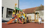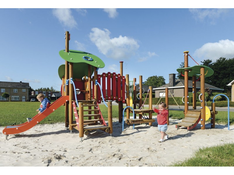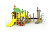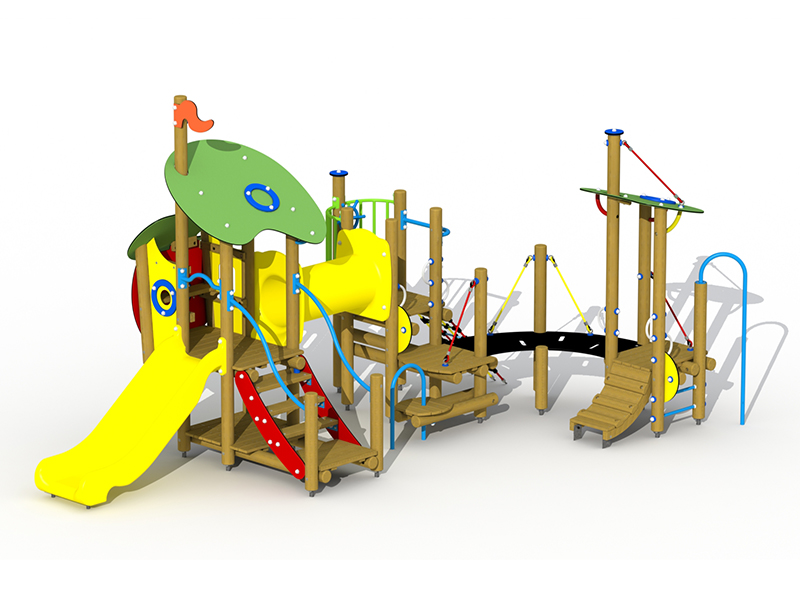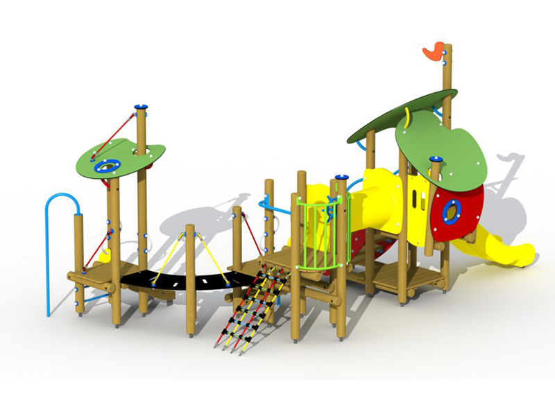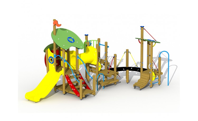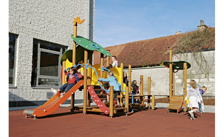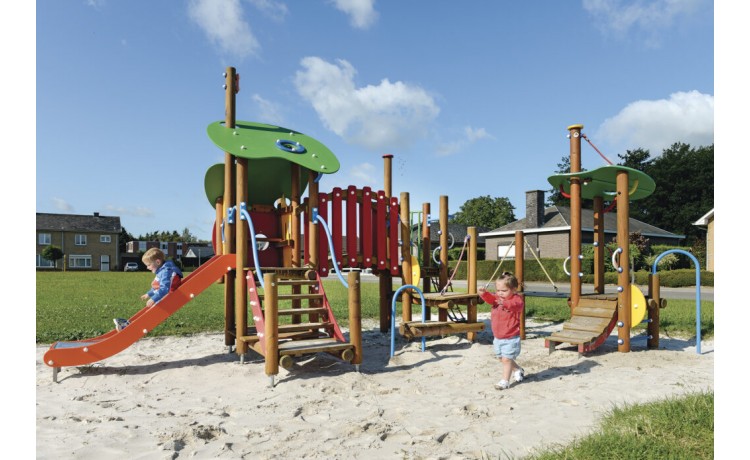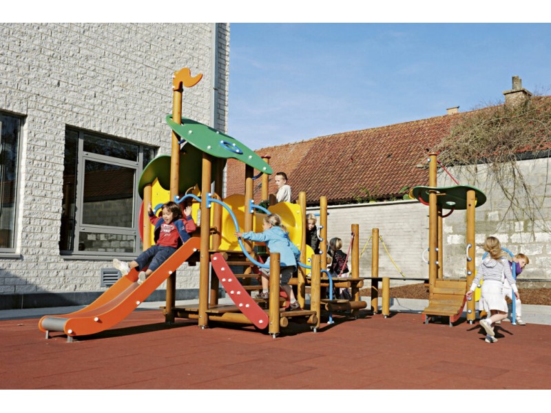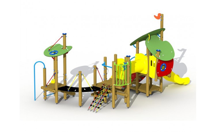 Jeu de combinaison panaché pour les enfants de 2 jusquà 6 ans. Le jeu est composé de plusieurs plates-formes à de différents niveaux qui sont connectées mutuellement par des eléments de connexion ludiques. Le jeu est composé dune maisonette avec une hauteur de plate-forme de 93 cm. On peut descendre de cette plate-forme par un toboggan synthétique. La maisonette est à atteindre par un escalier avec des rampes en métal. En bas, il y a un plancher de jeux et en haut, dans la maisonette, il y a une banquette. Lensemble est couvert par un toit double en panneaux arrondis multicolores en polyéthylène HDPE. À partir de la maisonette, il est possible de grimper à une plate-forme ouverte par un tunnel à grimper à double parois en polyéthylène HDPE. La plate-forme est equipée dune balustrade avec une clôture métallique colorée à laquelle il y a un volant en matière synthétique. La plate-forme est à atteindre par un filet descalade et une échelle de double plate-forme avec une rampe métallique et un arc à grimper.