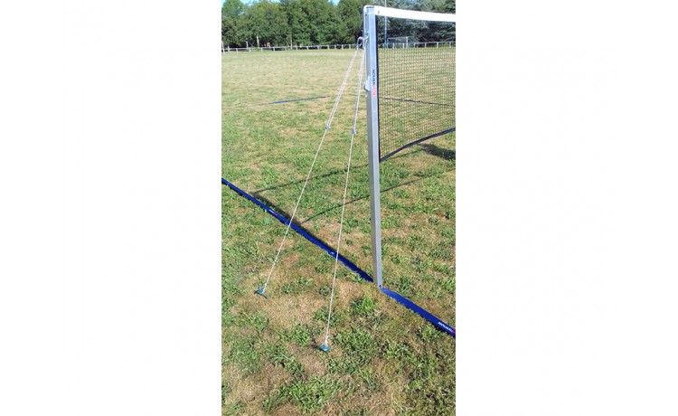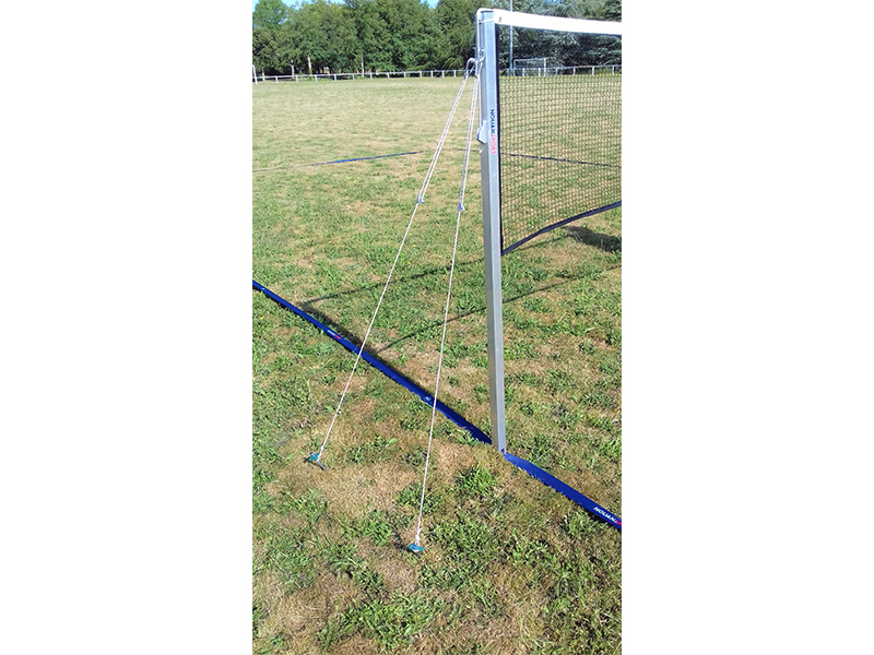 - 2 poteaux aluminium carré de 40 x 40mm spécialement conçus pour le jeu de badminton sur herbe, avec tige de maintien au sol, poulie de guidage de la drisse de tension du filet en partie haute, liaison continue du filet au poteau sur sa hauteur et tension de la drisse par cabestan