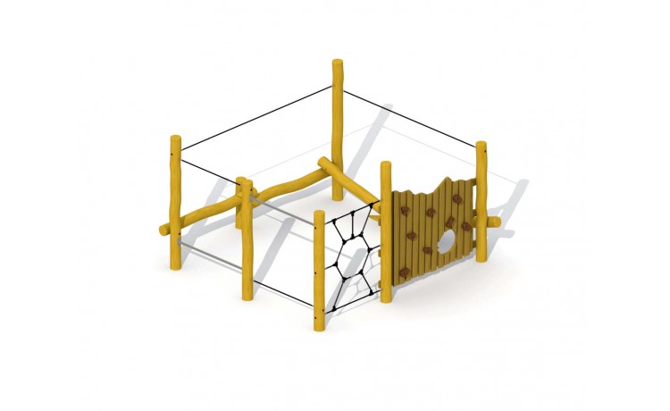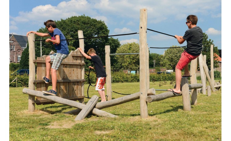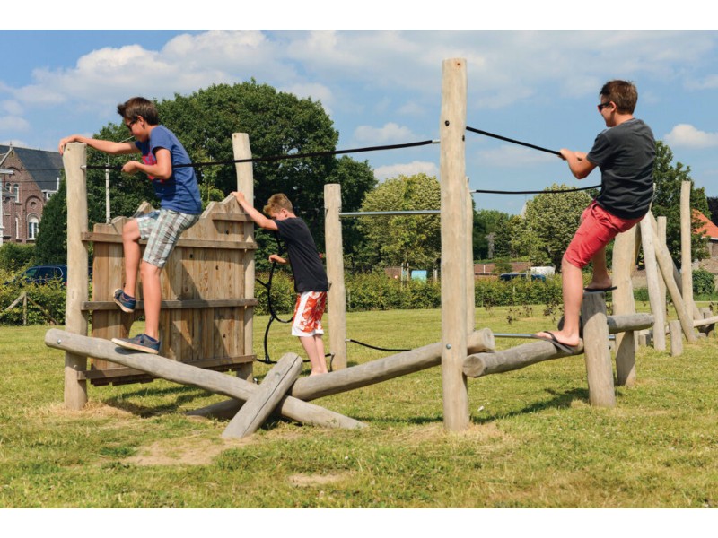 Parcours descalade pour les enfants de 4 à 12 ans. Le parcours est construit en carré et est composé de différents éléments comme par exemple un mur descalade et un filet à grimper. En plus, on peut aussi parcourir une distance en traversant une corde, un barrre fixe ou des poteaux en robinier en saccrochant à une corde ou un tube en inox.