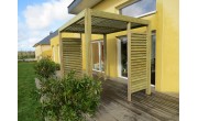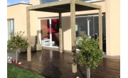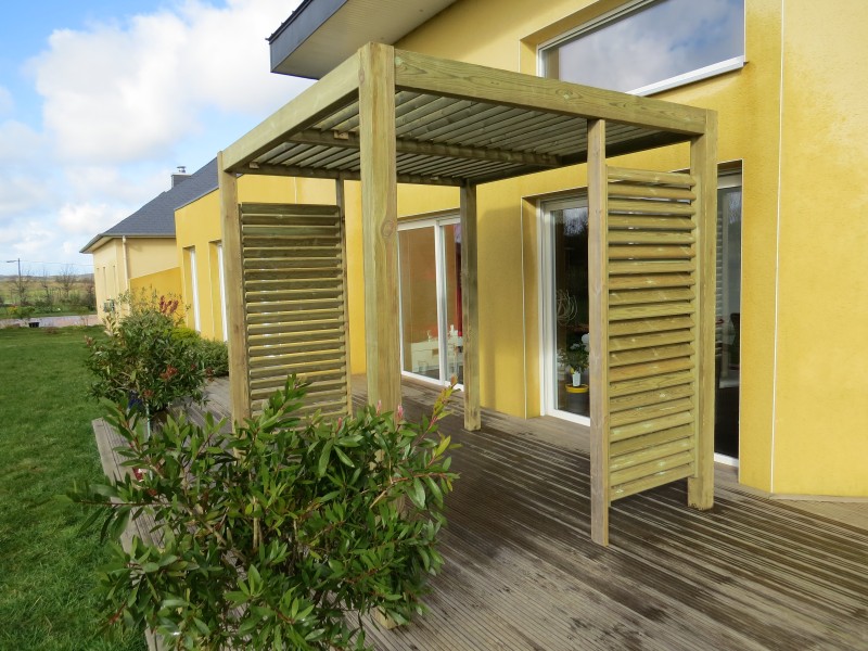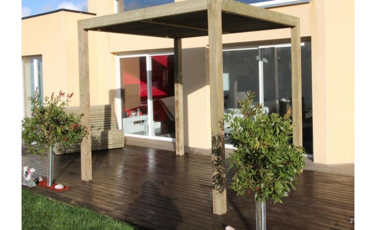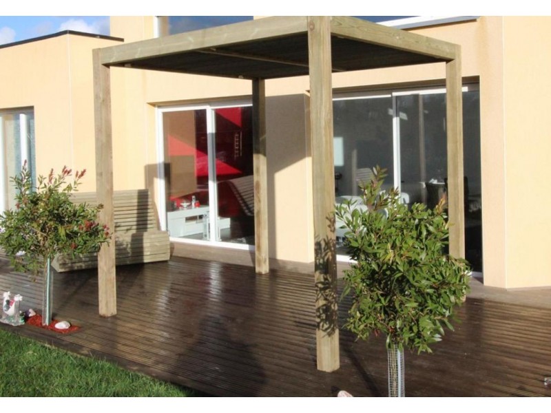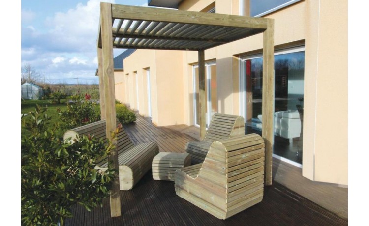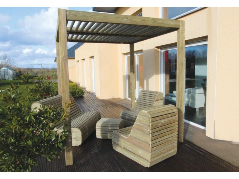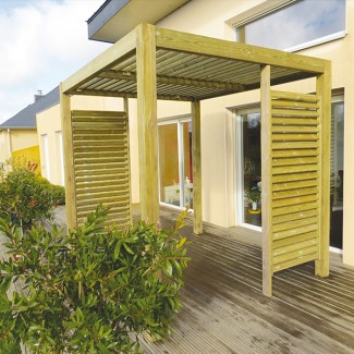 Dimensions 3m x 3m H2m35Poteaux 140x140 mm avec surlongueur pour scellementSablière 145x70 mm avec assemblage par queues d'arrondeVisserie inoxOptions : Brise-soleil en lames 95 x 21 mm et 45 x 35 mm.- Brise-soleil toiture 2m72 x 2m72 - Brise-soleil paroi 0m92 x 1m80 Pin sylvestre CL4 CTB B+ /TANALITH E/NF EN 5990. Garantie 10 ans contre le pourissement dû aux insectes et champignons