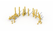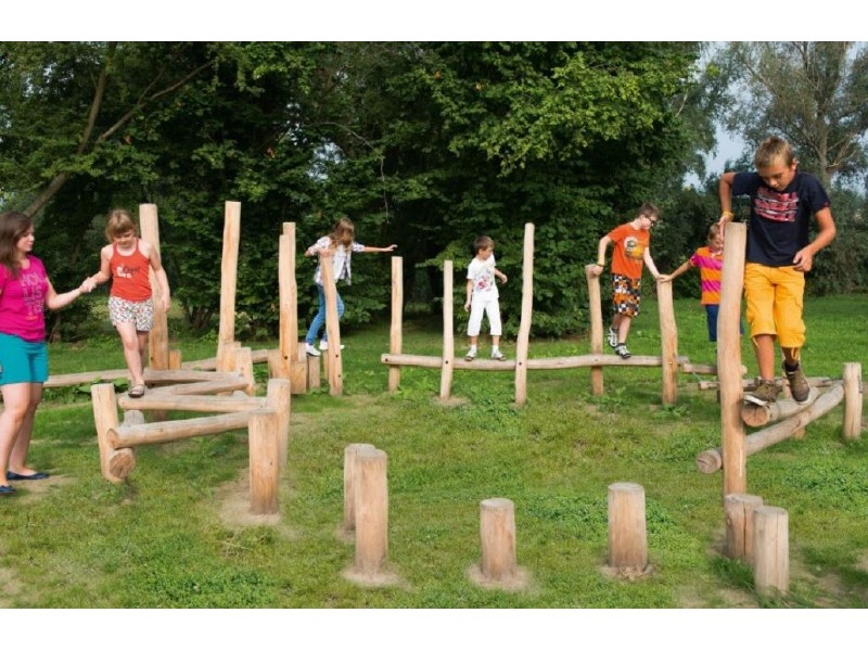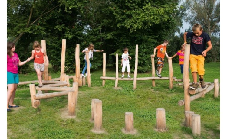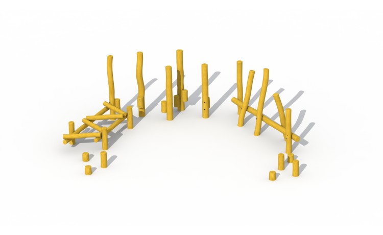 La piste forestière se compose de combinaisons diverses de poteaux. Il ya 3 unités de jeu et des pas-de-géants: un mikado, un parcours dagilité latéral, un rondin déquilibre et des pas-de-géants. Les différentes combinaisons sont placées dans un demi-cercle. Le pont souple est fixé par des chaînes en inox.