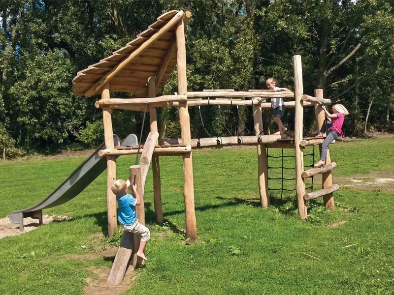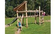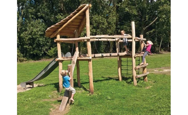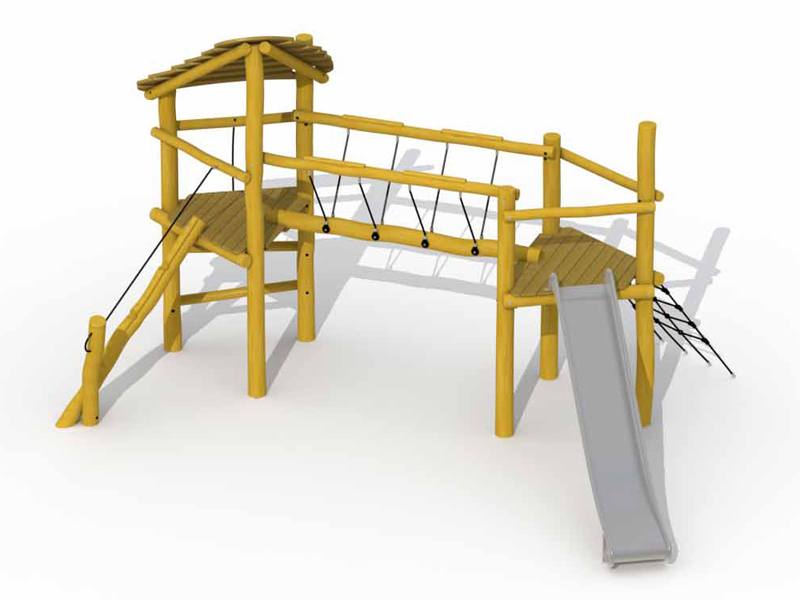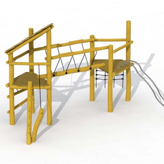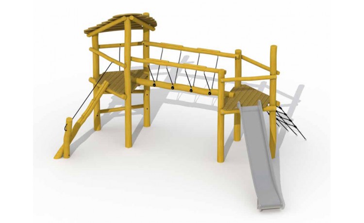 Une combinaison de 2 plates-formes reliées par une passerelle pour des enfants à partir de 6 ans. Les planches du sol et du toit sont faites en mélèze, le reste en robinier. Lappareil est à atteindre par un filet descalade, une échelle ou une corde descalade (reposant sur un rondin incliné). On peut descendre lappareil par un toboggan en inox. Tous les écrous et boulons sont protégés. Ce jeu est ancré directement dans le sol avec du béton.