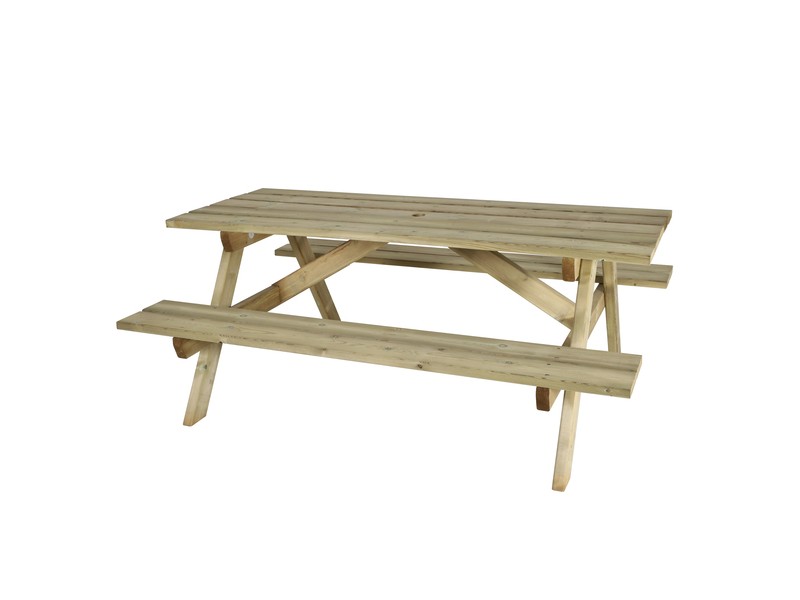 Table d'extérieur en bois à poser, avec trou pour parasol (Ø60 mm) et accès PMR.