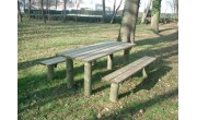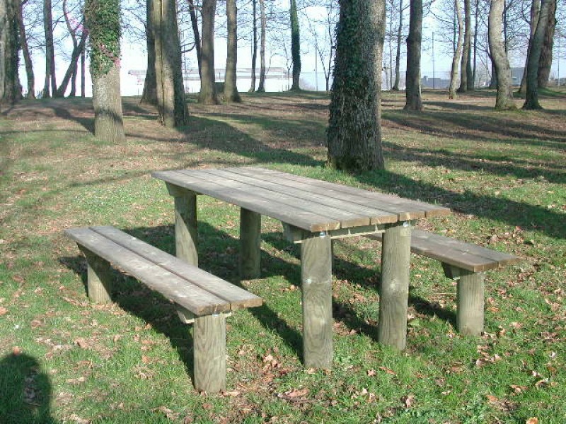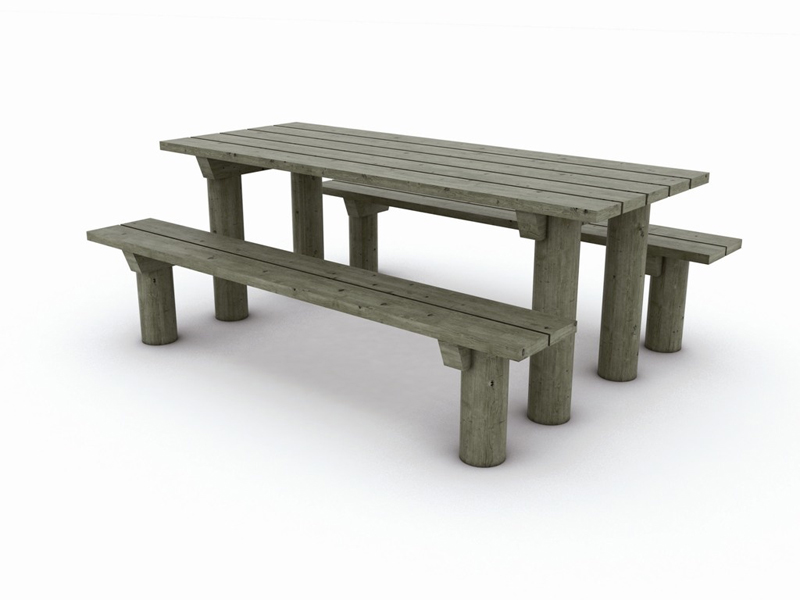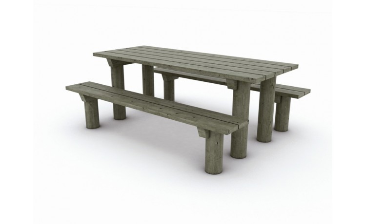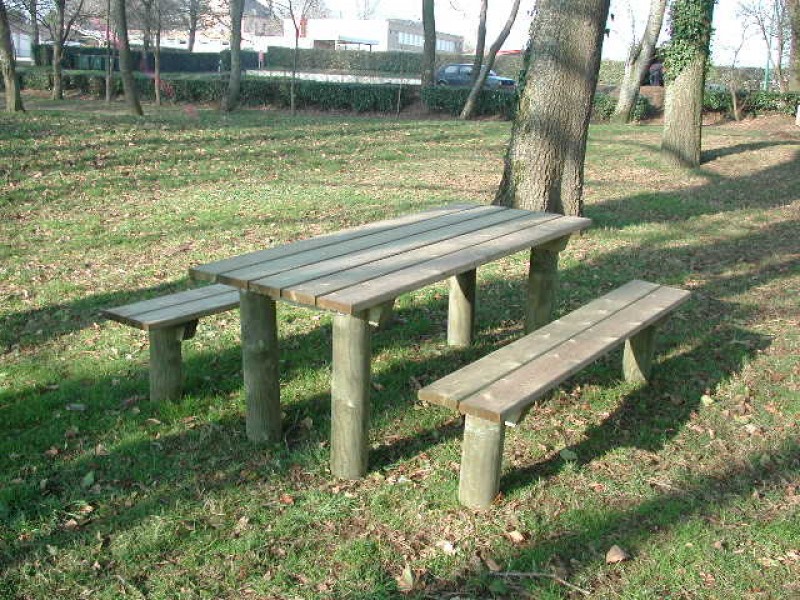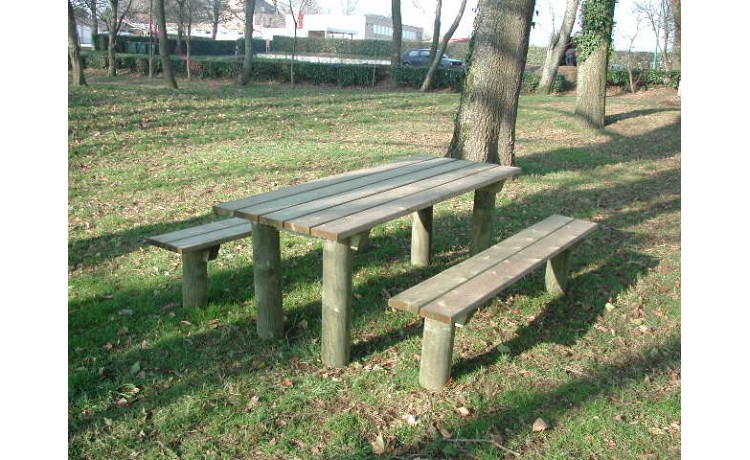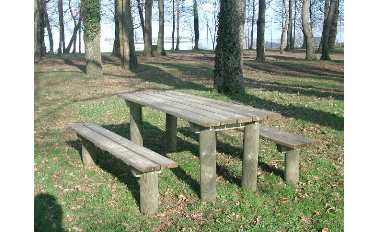 Table en pin traité de CL4, à sceller, prévue avec sur-longueur de bois + 2 bancs inclus