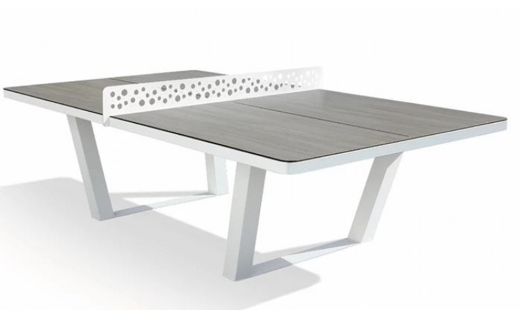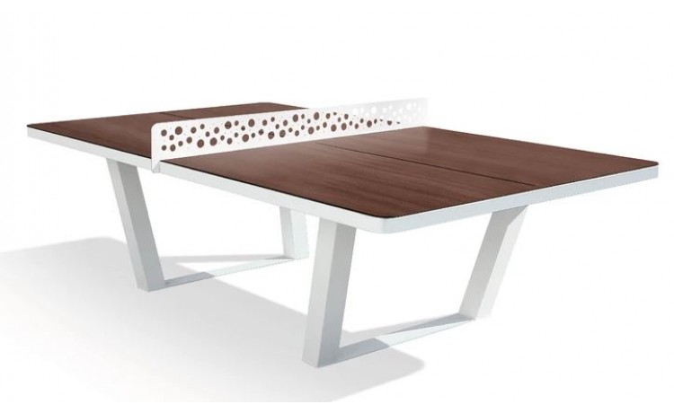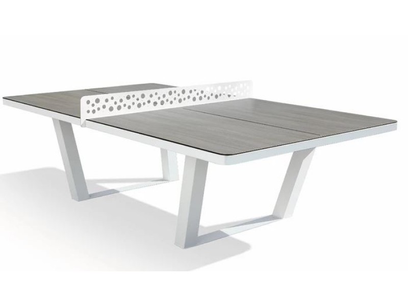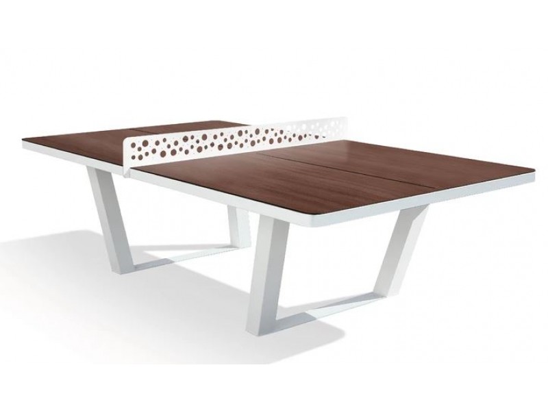 La table est traitée avec un laque bi-composant bleu. La ligne et le filet sont enlaque blanc. Résistante aux intempéries et au vandalisme.