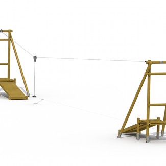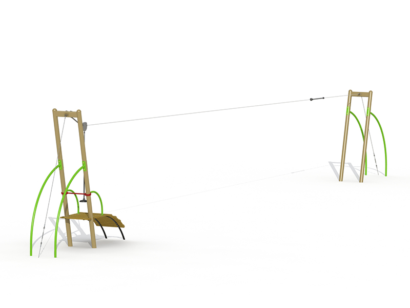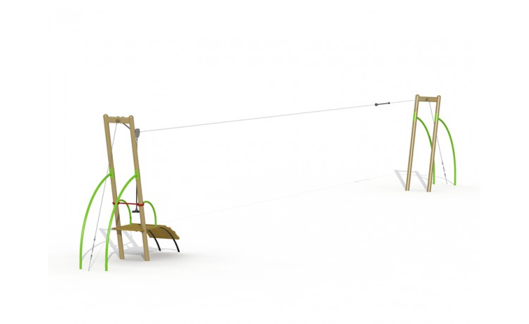 Matériaux :- poteaux métalliques Ø 127 mm et tubes métalliques Ø 35 mm en polyester coating- étriers de serrage en aluminium- chapeaux des poteaux en polypropylène- planches des plate-forme 22 et 35 mm en mélèze- siège suspendu à une chaîne galvanisée avec gaine- chariot en inox- ressorts amortisseurs- L 25.00 m x L 0.9 m x H 3.6 m- Emprise au sol 106 m²- hauteur de chute < à 1,00 m- tranche d'âge 6-15 ans- temps de montage : 10 heures à 2 personnes