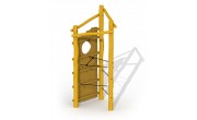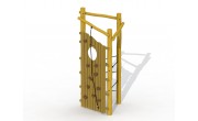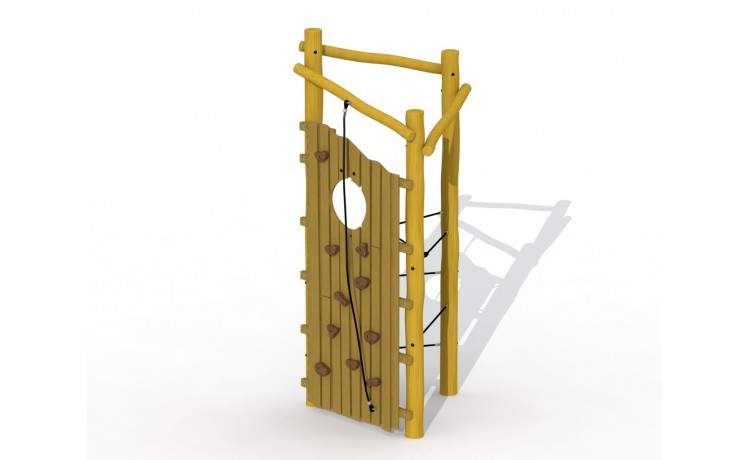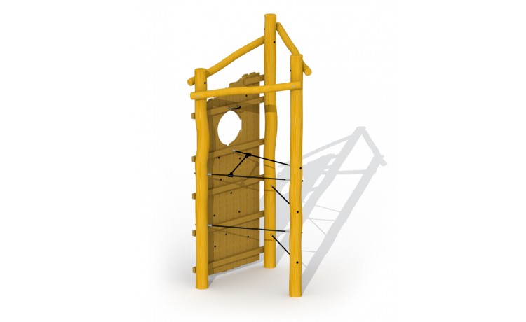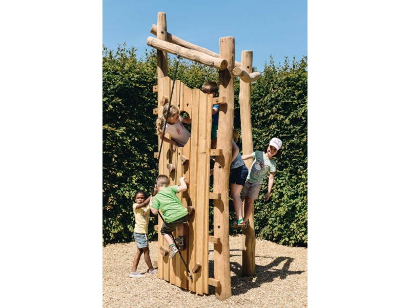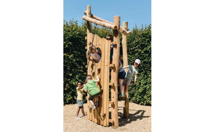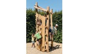 Tour à grimper offrant des défis pour les enfants de 6 à 16 ans. Le mur descalade est fait en mélèze, le reste du jeu en robinier. On peut atteindre la tour par un mur descalade aux poignées en padouck et des cordes à grimper en câble de traction. Tous les ecrous et boulons sont entièrement revcouverts. La construction est ancrée dans le sol avec du béton.