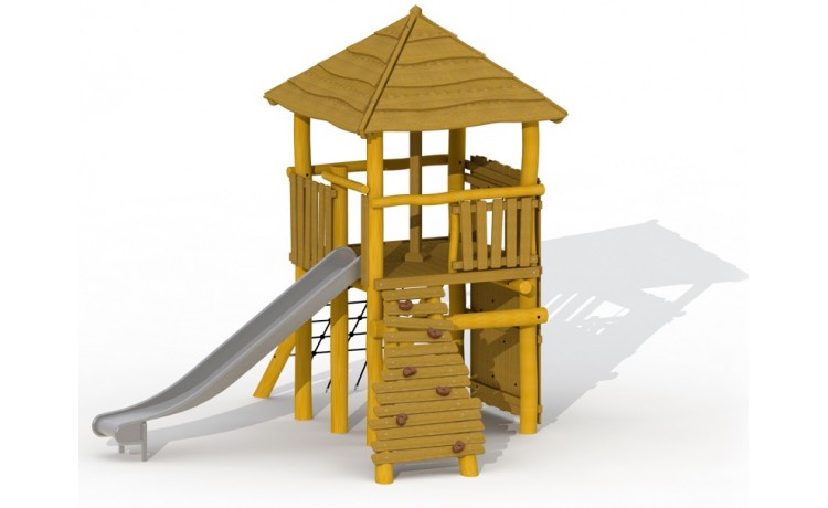 Tour constitué de 1 plate-forme pour les enfants de 4 à 12 ans. Planchers et planches de la toiture, du mur descalade et des parois latérales réalisées en mélèze, le reste est fait en robinier. La tour est accessible par 2 murs descalade avec des prises en padouk mais également par un filet à grimper et une structure descalade comprenant des rondins et des cordages en câble dacier. Toboggan en inox.